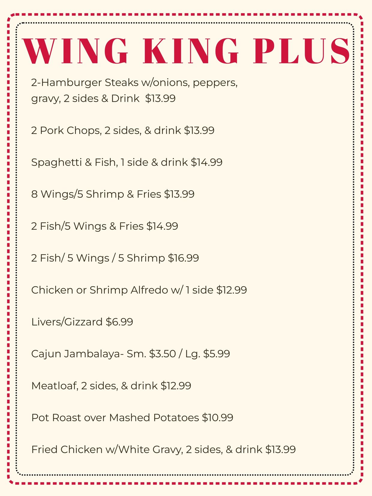 This is William & Robin Pride. The owners of Wing King Plus. It is our pleasure to serve our community in the Huntsville area. We hope our restaurant makes each and every customer feel at home, safe, and cozy. Our menu consists of a variety of tasty foods.